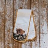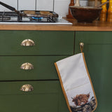 Cotton drill, double oven glove with camel coloured binding, featuring an artists impression of Neale's favourite coo Sheila Beag 3rd of Airyolland.
